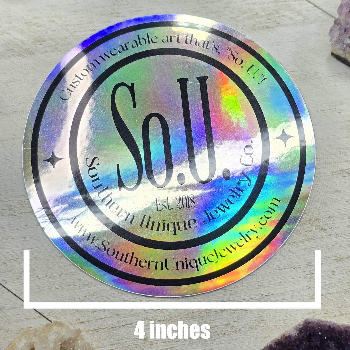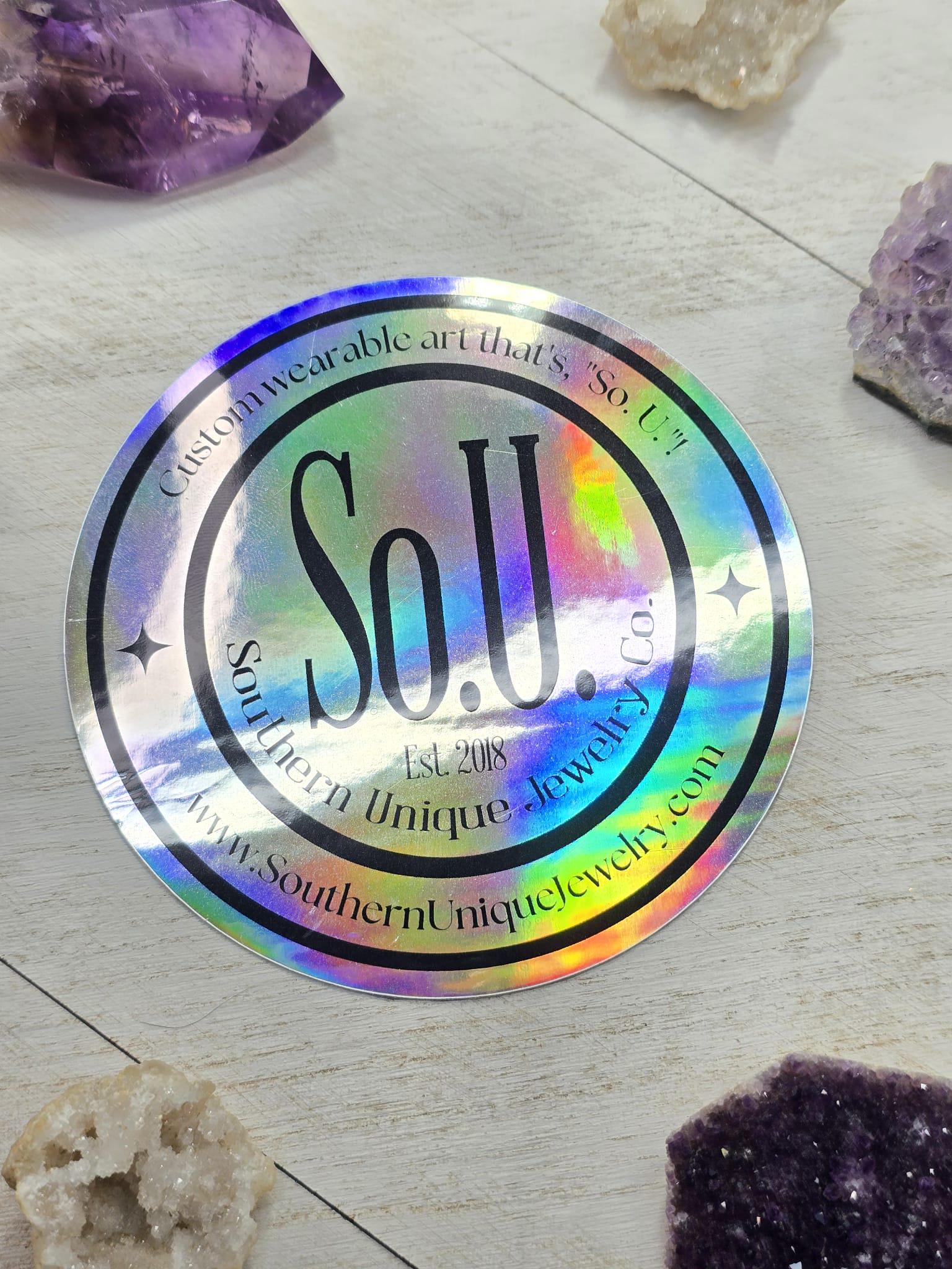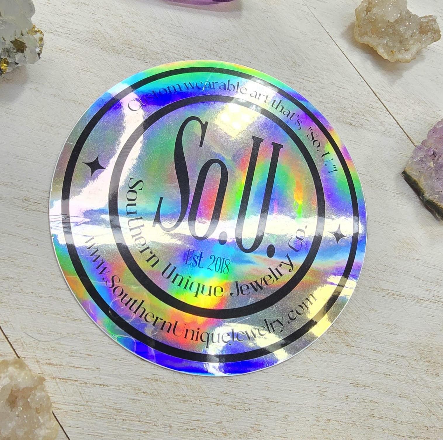 This is a weather proof, vinyl, holographic Southern Unique Jewelry bumper sticker. Rock it on your favorite water bottle, your laptop, or your bumper to show your support for one of your favorite jewelry artists!